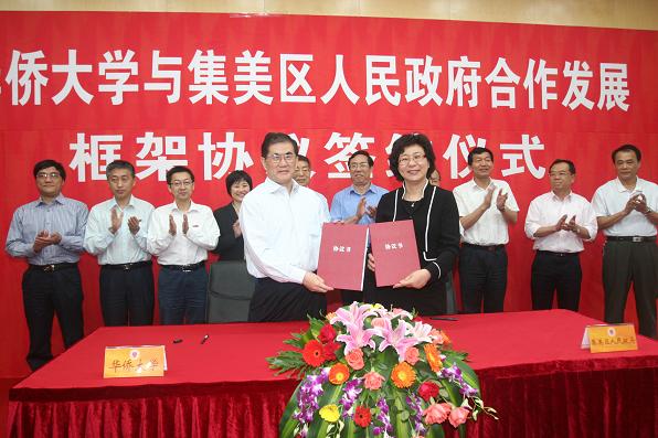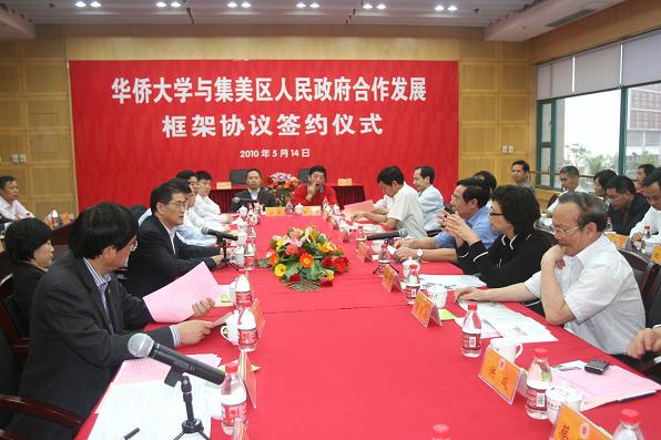“beat365英国官方网站已被国家教育部和财政部正式列入国家特色项目建设的高校。华大将用好这一政策,高标准、严要求,立足集美、面向全国、走向世界;集美文教区将出现一所海内外知名的高水平大学,成为这个新兴现代化城区的教育高地、文化高地、科技高地和人才高地。” 这是beat365英国官方网站校长丘进在“beat365英国官方网站与集美区人民政府合作发展框架协议”签约仪式上充满信心的表达。 5月14日下午,丘进校长和厦门市集美区倪超区长,分别代表双方在王源兴国际会议中心二楼会议室签订“beat365英国官方网站与集美区人民政府合作发展框架协议”。此举,标志着双方的合作翻开新的一页:进入在更宽广的领域、更高层面上进行长久合作,以实现互利双赢、共同发展的新阶段。签字仪式由刘斌副校长主持。 集美区委书记黄锦坤,率领集美区委、区人大、区政府和区政协及集美区有关部门领导30余人出席签约仪式。 beat365英国官方网站党委书记李冀闽,党委副书记朱琦环,副校长徐西鹏、刘塨、张禹东出席签字仪式,并上台见证签约。校长助理彭霈、张云波、曾路,及学校有关部门领导出席签约仪式。刘塨副校长宣读协议文本。 根据协议,华大将充分发挥学科优势,鼓励和支持相关专业的博士、专家学者进驻集美相关博士后科研工作站、工程技术研究中心、企业技术中心等研发机构,结合集美区建设发展需要,积极开展应用性研究和开发性研究;积极承担区内有关科研课题;双方共同搭建产学研合作平台,在集美区成立技术孵化机构,形成产学研孵化机制。采取厂校、区校合作等形式,建设实验基地或中试基地,多形式、多渠道地开展科技应用与培训工作。 根据集美区的实际需求,华大为其党政机关工作人员、企业家和其他专业人员举办各种类型的继续教育和专题培训,尤其是法律硕士(JM)、工商管理硕士(MBA)、公共管理硕士(MPA)、工程硕士,以及即将开展的其他多种领域(如财务、税务、警务、旅游、城市规划等十余种专业硕士学位)的教育。与集美区共建教育平台,积极为集美区培养急需的各类高级专门人才。 集美区将重点支持beat365英国官方网站厦门校区的建设,将学校列入集美区高等教育发展规划;全力解决校区建设用地的征地、拆迁等工作,确保校区建设用地需要,使beat365英国官方网站如期完成校园建设的规划。集美区政府还将积极承接和安排beat365英国官方网站学生开展社会实践活动,并根据实际需要在相关单位设立“beat365英国官方网站学生社会实践基地”,为beat365英国官方网站学生社会实践活动提供各种便利。积极鼓励和引导区内重点企业到beat365英国官方网站举办各种人才招聘会,吸收优秀毕业生到集美区就业、创业。 丘进校长热情致辞欢迎各位嘉宾光临华大,衷心感谢集美区委区政府和集美人民,在华大建设过程中,将华大视为自己的大学,以最大的热诚支持新校区的建设,在征地拆迁、治理环境、改善交通、方便生活等方面,所给予学校的巨大帮助。并向来宾简要介绍华大发展概况和建校50年来为国家教育事业,为地方社会、经济建设,为港澳回归、稳定和繁荣,为祖国统一大业,为中国国际关系的不断改善做出的重要贡献。 丘进介绍了厦门校区建设缘起和进展情况。称在双方的努力下,华大开始融入集美,主动服务地方各项事业。几年来,华大已经同厦工、金鹭特种合金、日上钢圈等企业、单位签订了科研攻关、产品开发、设计规划、人才培养等各种合作项目近百个,并取得初步成效,显示高校在地方发展中的积极作用。 倪超区长在致辞中盛赞“华大校园风景如画,充满着勃勃生机,是陆续进入集美区诸多高校中的佼佼者;引进华大,给集美发展很大的带动”。相信通过签订协议,华大能够以突出的智力优势和人才优势来扶持地方,帮助集美经济和社会更快地发展;集美区也理应为华大发展创造更好的环境,全力帮助解决征地拆迁、周边环境治理和相关设施配套等问题,让华大校园更完整、环境更漂亮。 双方共同祈愿:一起努力,把华大建得更大,集美建得更美。 签约仪式前,出席仪式的校领导一起到厦门校区大门前迎候集美客人,并陪同来宾登临行政大楼26层俯瞰新校区全景,参观四端文物馆和厦门校区模型室。 据悉,为进一步发挥学校在为侨服务、为地方经济建设中的作用,2002年12月,国家决定建设华大厦门校区。2006年9月新校区正式启用。目前,厦门校区一期工程业已完成;二期工程正在开工建设,有9个学院在厦门校区成建制办学,学生规模逾万,高效有序的管理体制已经建立。