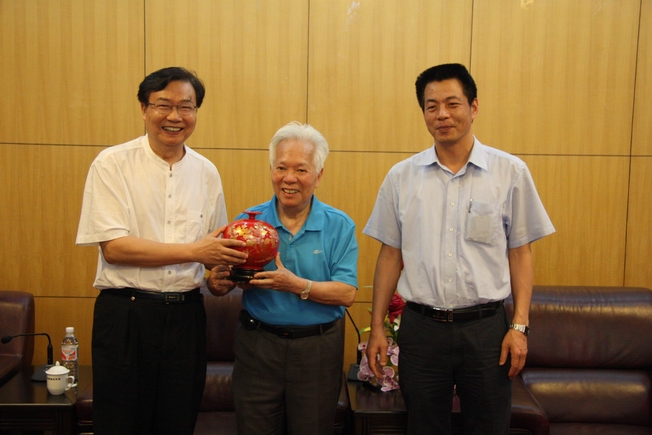 副校长吴季怀(右)、老领导庄善裕(中)向客人赠送纪念品