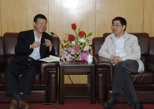 副校长关一凡(右)在陈嘉庚纪念堂二楼接待室会见访问团一行