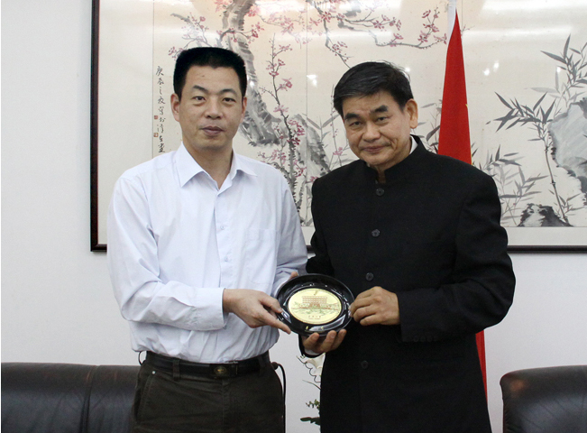 吴季怀副校长(左)与马来西亚客人互赠纪念品