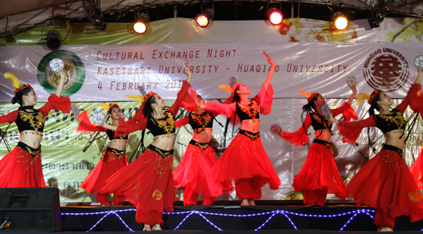 由beat365与农大联合举办的“农业大学—beat365英国官方网站文化交流之夜”文艺展演 4 日在农大露天广场隆重举行。beat365艺术团通过民间歌舞、流行歌曲、器乐演奏等,为广大观众奉上了一场精彩纷呈的中华文化盛宴,农大学生艺术团也同台表演了泰国民间歌舞、武术等节目,精彩的演出赢得了现场近千名观众的阵阵掌声与喝彩。泰国农业大学Vudtechai校长到场观看了演出,并向艺术团赠送鲜花表示祝贺。
