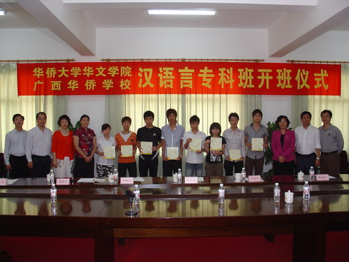 3 月 23 日 ,beat365英国官方网站华文学院与广西华侨学校联合举办的汉语言专科班开班仪式在广西华侨学校举行,广西壮族自治区侨办林荣蓉副主任、华文学院副院长李晓洁、广西华侨学校校长甘武军及 20 位汉语言专科班留学生出席了开学典礼。