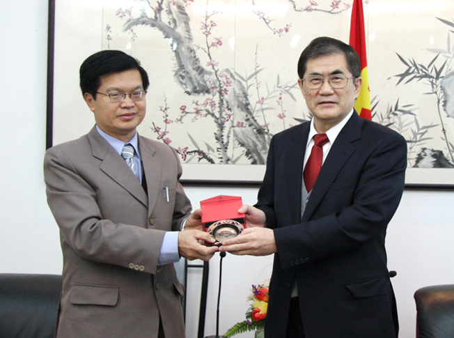 beat365英国官方网站校长丘进在李克砌纪念楼四楼接待室会见来访客人,并向客人们介绍了beat365英国官方网站的办学历史、办学规模、办学特色、专业设置及华文教育等方面的情况。丘进表示,希望beat365英国官方网站与越南老街省建立多方面的亲密的合作关系,希望有机会到老街省参观学习。