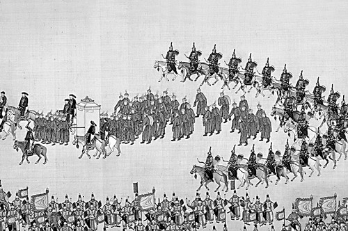 展品中有一件出自内地藏家的画卷十分引人注目——金昆、郎世宁的《大阅图》卷。据了解,乾隆登基后定下每三年大阅一次的制度,并于1746年下旨任命以金昆为首的十位宫廷画家绘制《大阅图》,分为“幸营”、“列阵”、“阅阵”和“行阵”四卷。目前,所知《大阅图》存世仅两卷。第二卷“列阵”藏于北京故宫博物院,本次展出的为第三卷“阅阵”,描绘的是乾隆亲临阵中检阅的盛况,为绝世孤品。
