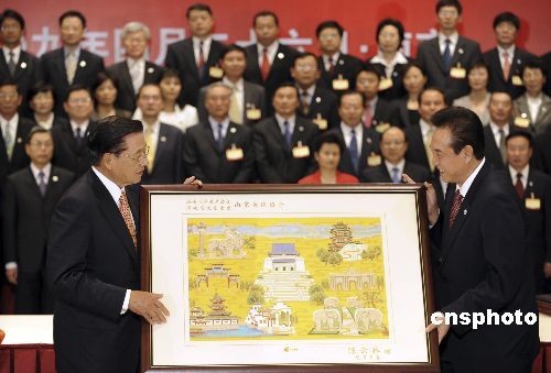 4月26日下午,陈云林向江丙坤赠送礼品“锦绣”,“锦绣”以江苏云锦制成,描绘着南京中山陵等著名景观。 中新社发 廖攀 摄