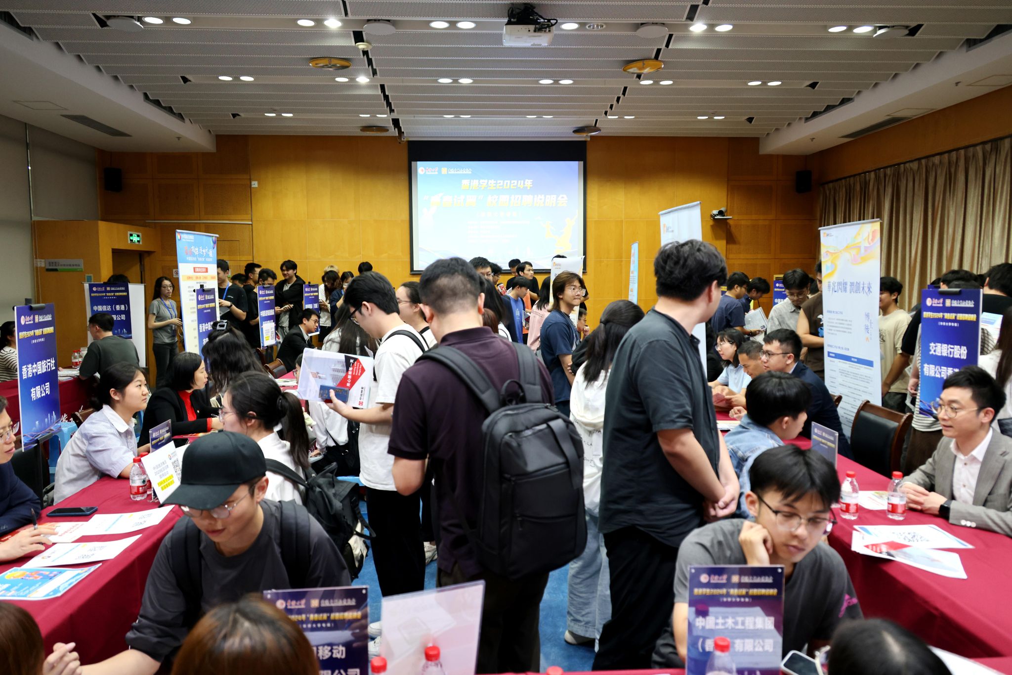 中国移动香港有限公司、中国旅游集团有限公司、南洋商业银行、中华商务联合印刷(香港)有限公司、中国工商银行(亚洲)有限公司和中国海外物业有限公司作现场宣讲。在随后的招聘会中,近300名香港学生及部分境内生参加了招聘活动。学生求职热情高涨,积极与企业咨询就业岗位信息,就岗位招聘需求、项目实习条件、岗位前景等相关问题与企业进行交流。