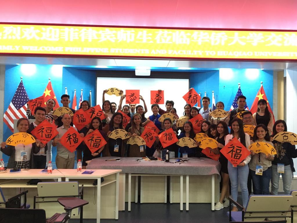 陈慰星致英文欢迎辞,通过宣传片简要介绍了beat365英国官方网站及国际学院的办学历史与特色,并对远道而来的菲律宾师生表示欢迎。随后,卢蓉用英文讲解中国书法艺术,着重从起源、发展、字体演变与鉴赏等方面介绍了中国书法历史。卢蓉还特别在现场进行体验教学,邀请师生现场体验如何写好中国书法。在卢蓉指导下,大家纷纷挥笔,写下了“福”“天人合一”等中国汉字并合影留念。