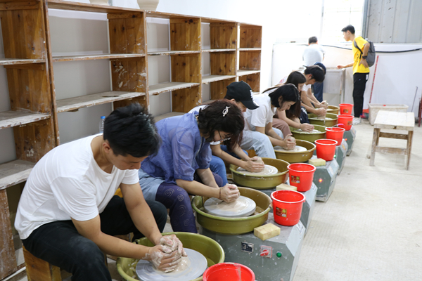 在德化陶瓷博物馆,泉州工艺美术学院郭庆豫老师为大家解说了馆内藏品和罗小平雕塑·泥片成型塑造艺术研修班师生作品展;在泉州工艺美术学院,同学们在老师指导下体验手拉胚制作,加深对中国陶瓷艺术的认知;在陶瓷制作工坊,同学们以中华人民共和国成立70周年为主题,发挥主观能动性创作了20余个瓷杯瓷碟;在德化县水口镇昆坂村中共福建省委旧址,同学们在向导的介绍下了解当年中共福建省委的伟大事迹,实地走访通往牛寮沟的阶梯路。