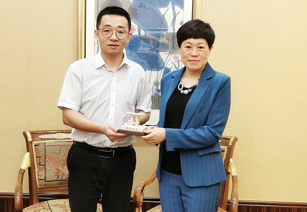 beat365澳门联络处向陈虹女士赠送学校纪念品
