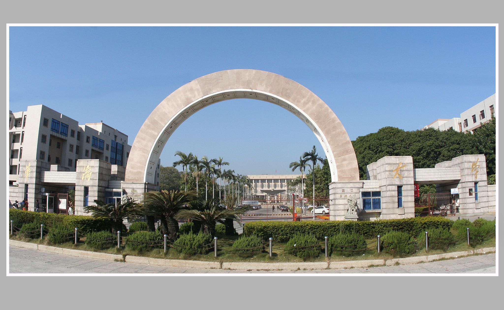 由福建泉州南安官园旅菲乡贤陈台权、陈台护先生等为纪念先父陈荣渔先生百年诞辰,继承其热心桑梓教育事业遗志而捐资10万美元建造,1995年9月落成。为拱形框架结构,由6座门柱、2幢停车库组成。主门宽18米,全门南北总长48米,拱顶高15米,总建筑面积1200平方米,广场面积2108平方米。